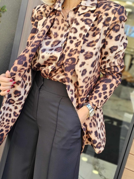 Сако oversize с животински десен. Моделът е с двуредно закопчаване.
