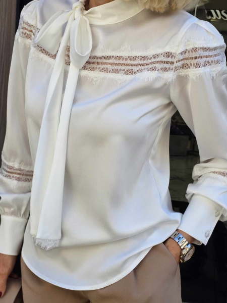 Риза от фина сатенирана материя с фишу и елемент на дантела. Моделът е свободен.