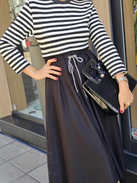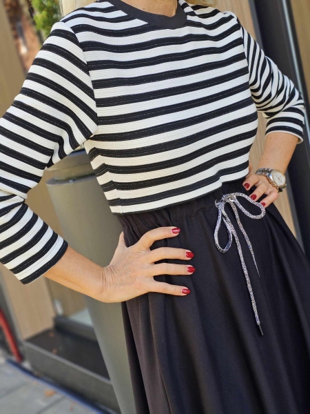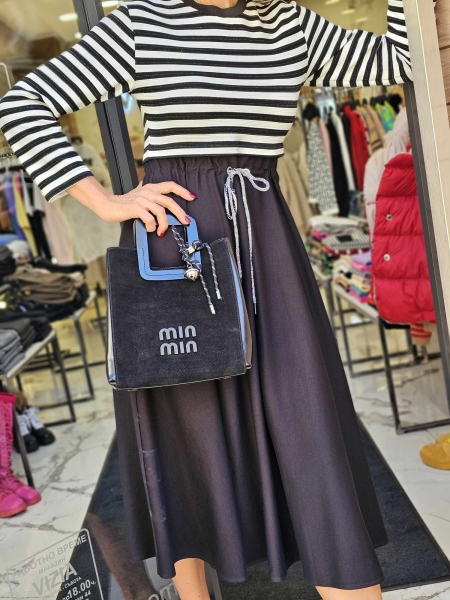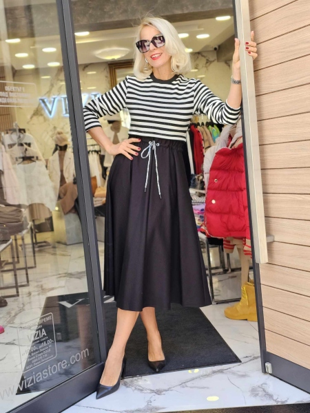 Рокля с миди дължина с вталена горна част и свободно падаща пола. Моделът се облича без закопчаване и има връзки на талията за вталяване.