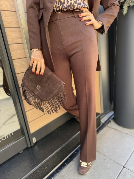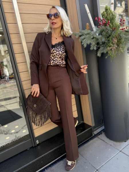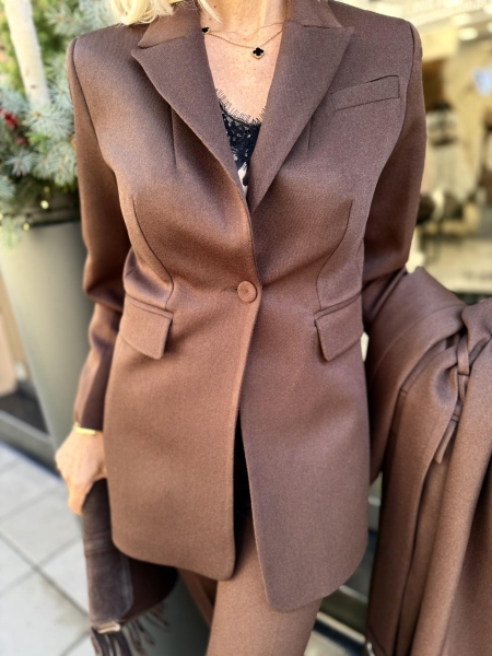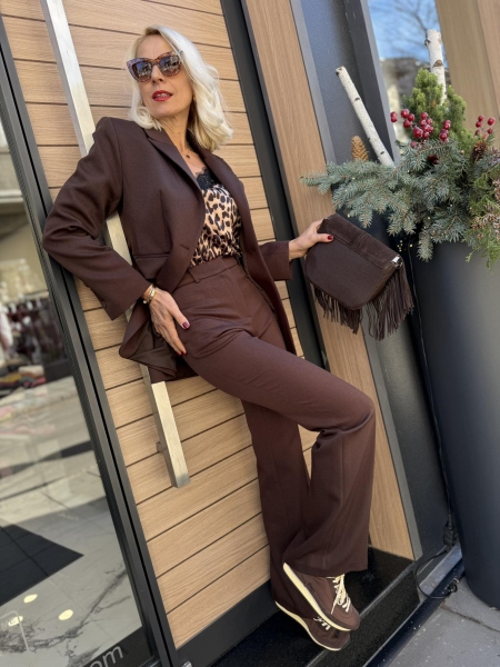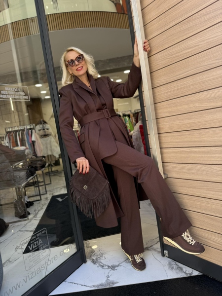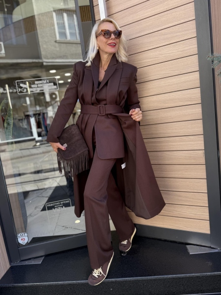 Ексклузивен сет от палто, панталон и сако от висококачествена материя в шоколадов нюанс. Палто без закопчаване с ревери и текситлен колан за талията. Вталено сако с издължрна кройка. Панталон с чарлстон кройка и ръб.