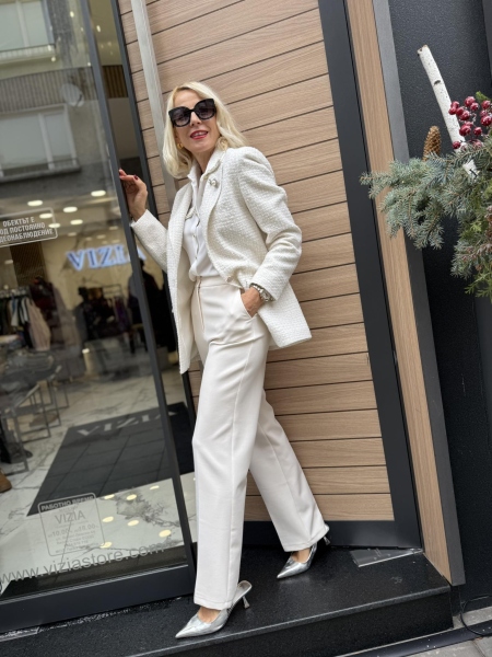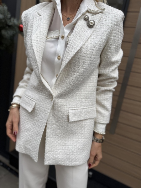 Костюм сако и панталон в цвят екрю. Сако от букле с издължен силует, закопчаване с копче и аксесоар брошка. Панталон с висока талия, прави и свободни крачоли с ръб, закопчаване с цип и копче.