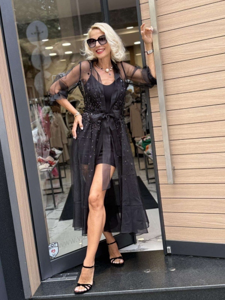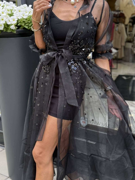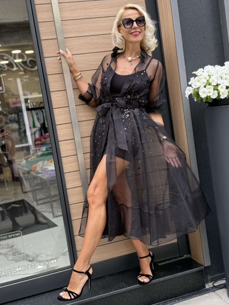 Рокля в черен цвят от две части. Дългата част е от ефирна прозрачна материя декорирана с камъчета и пайети без закопчаване с текстилен колан за вталяване. Късата част е от еластична материя с тънки презрамки.