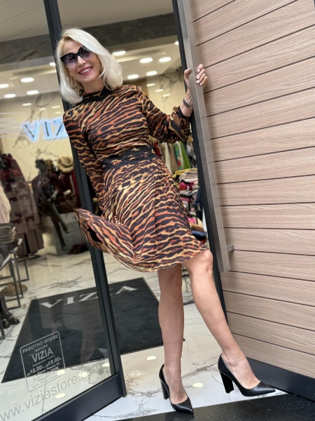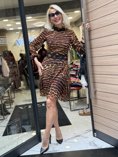 Рокля от фина материя с дълъг ръкав в животински десен. Моделът е с шев на талита и се закопчва с цип.