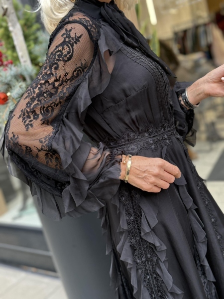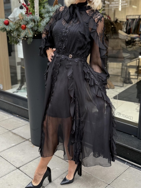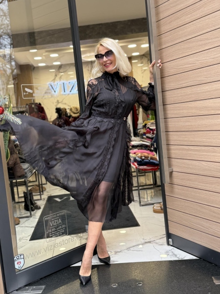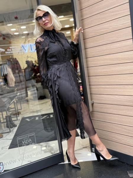 Рокля миди дължина в черно с елементи на дантела. Моделът е с шев на талията и се закопчава с цип. Към роклята има къса подвижна подлата.