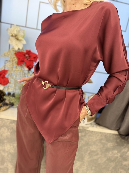 Блуза от фина сатенирана материя в цвят бордо с асиметрична кройка и реглан ръкав. Към нея има и аксесоар колан.