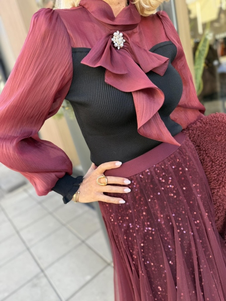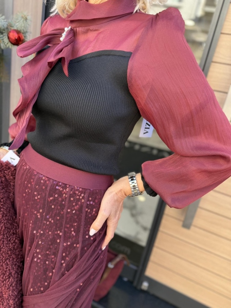 Блуза слим от рипсена материя с ефирни ръкави в цвят бордо. Универсален размер подходящ за S, M.