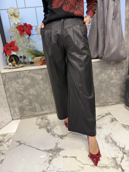 Панталон от еко кожа в черен цвят с басти. Моделът е с висока талия, широки крачоли, басти и ластик на талията.