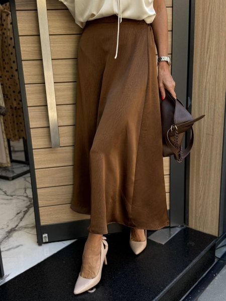 Пола от сатенена материя в кафяв цвят. Моделът е разкроен има ластик и страничен цип. Универсален размер подходящ за S, M, L.