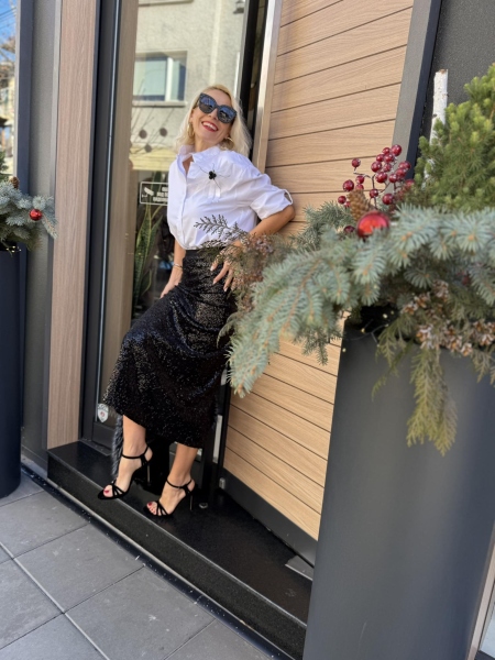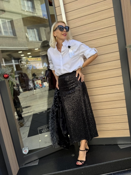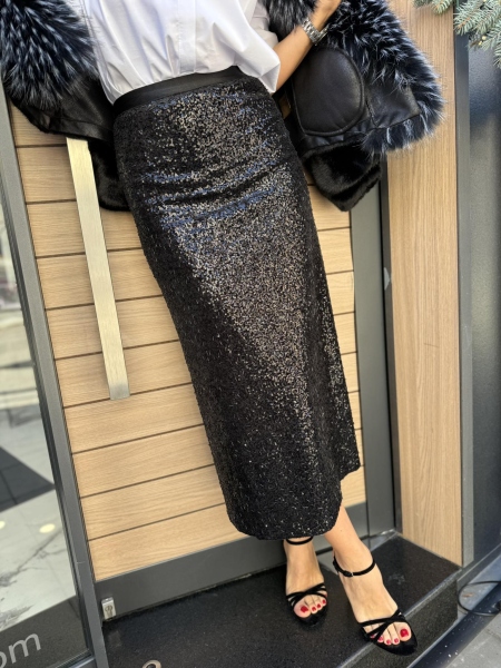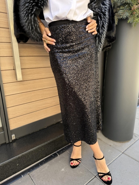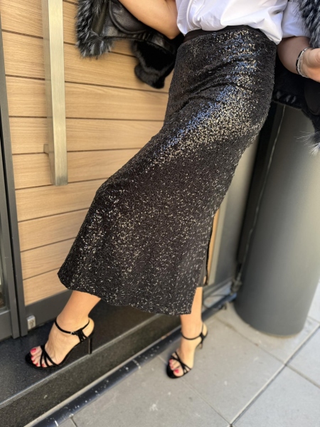 Пола с миди дължина изцяло декорирана с пайети в черно. Закопчаване с цип, ластик на талията и цепка .
