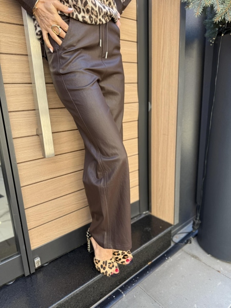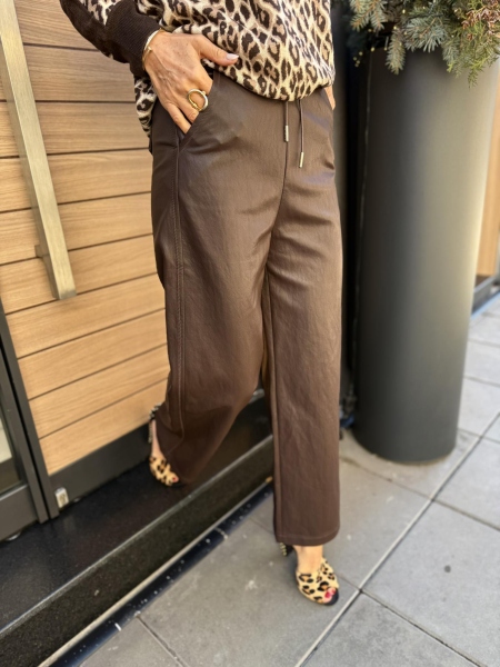 Панталон от еко кожа в тъмно кафяв цвят. Моделът е с висока талия, широки крачоли и ластик на талията.