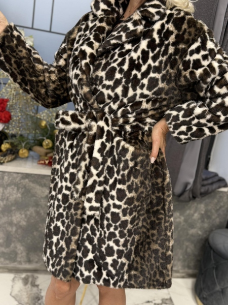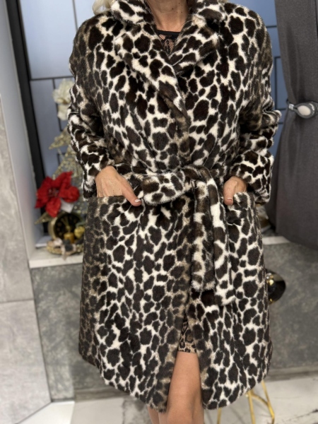 Палто от еко косъм със средна дължина. Моделът е със свободна кройка, закопчаване с копчета, колан за вталяване. Универсален размер подходящ за M, L, XL.