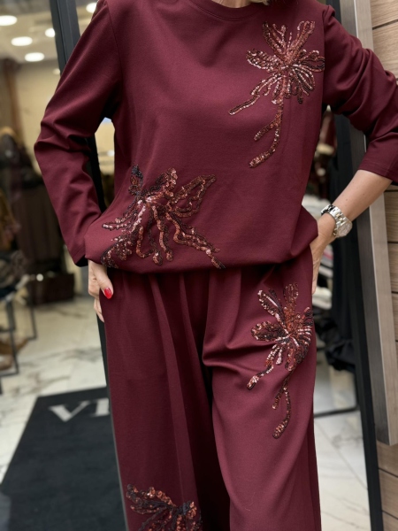 Комплект от трико в цвят бордо с декорация от пайети. Блузата е със свободна кройка, в долната част има стопери за вталяване. Панталонът е тип пола с ластик на талията и много широки крачоли. Универсален размер подходящ за L, XL, XXL.
