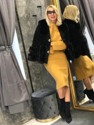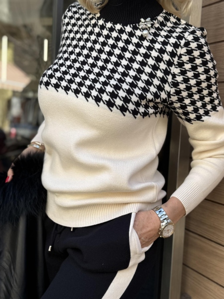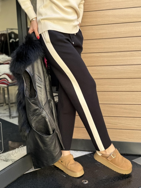 Комплект от фино плетиво в черно и екрю. Горната част е ти пуловер с поло яка. Панталонът е с право крачоли, ластик на талията и странични джобове.