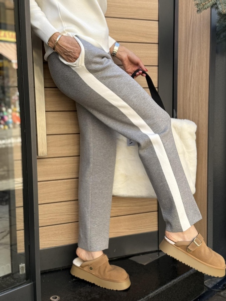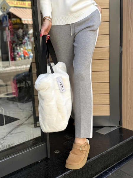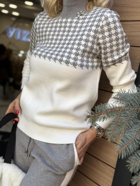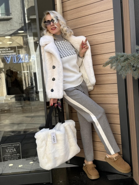 Комплект от фино плетиво в бяло и сиво. Горната част е ти пуловер с поло яка. Панталонът е с право крачоли, ластик на талията и странични джобове.