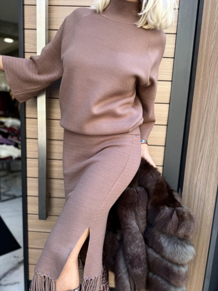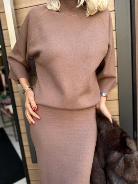 Комплект пуловер и пола фино плетиво в приятен кафяв цвят. Пуловерът е с поло яка, свободен силует и широки ръкави. Полата е слим с ластик на талията и странична цепка. Универсален размер подходящ за S, M, L.
