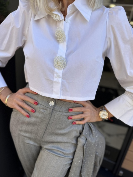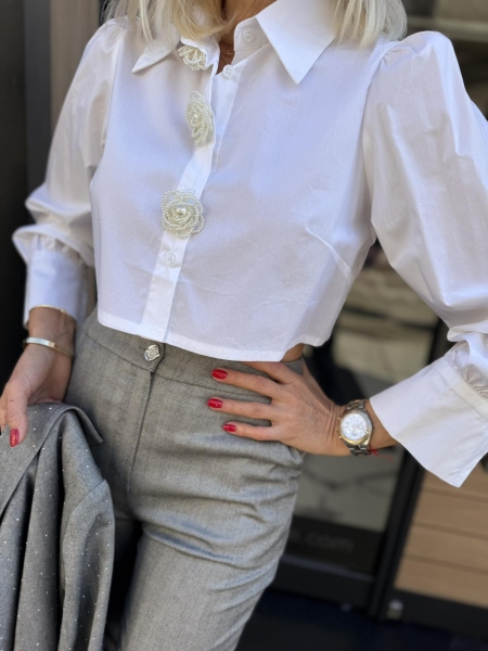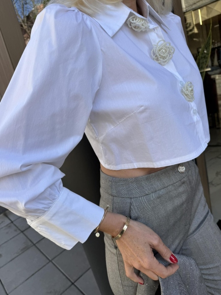 Къса риза в бял цвят от памучна материя. Закопчаване с копчета.