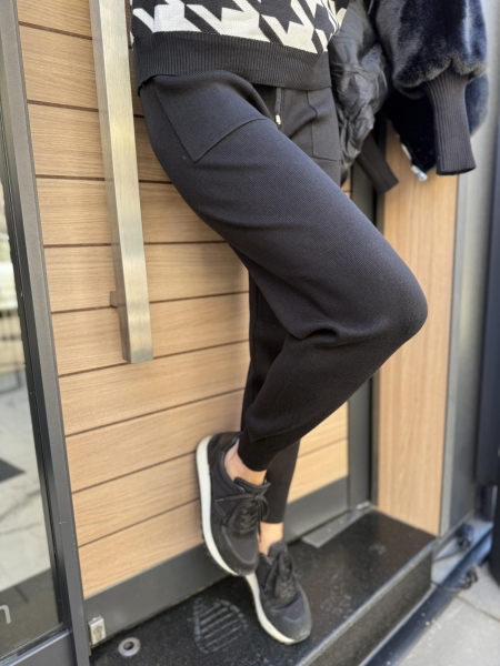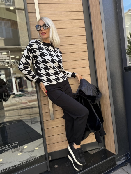 Комплект блуза и панталон от фино плетиво. Блузата е стандартна. Панталонът е с ластик на талията и стеснаващи се крачоли. Универсален размер подходящ за S, M.