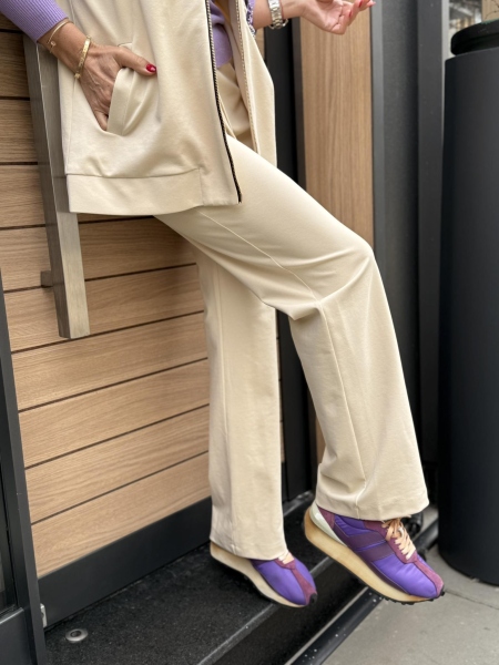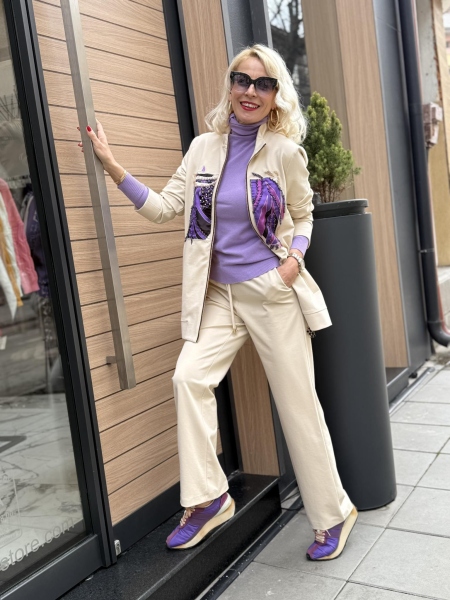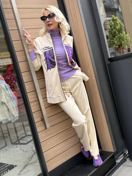 Комплект от трико в бежов цвят. Горната част е с издължена кройка и се закопчава с метален цип. Панталонът е с ластик на талията и свободни крачоли.