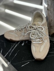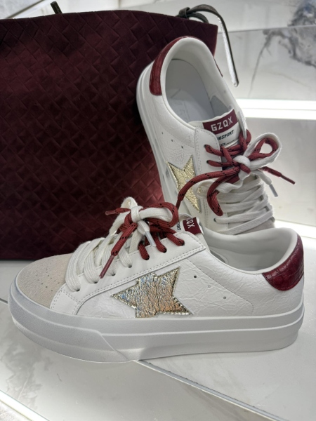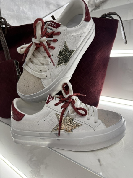 Бели кецове от естествена кожа с равна подметка и връзки в два цвята. Моделът има състарен ефект.