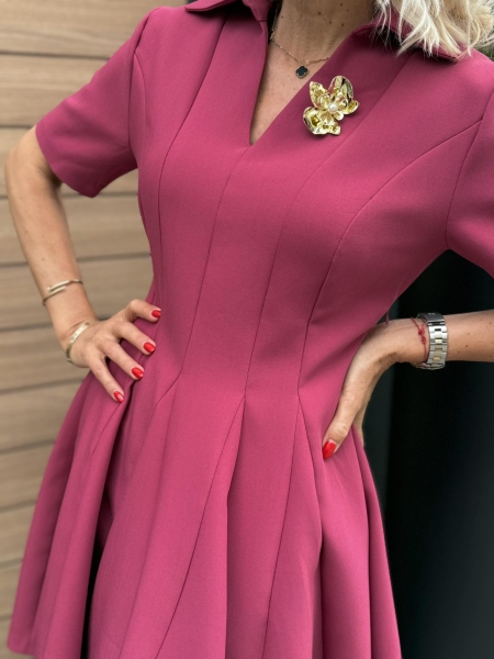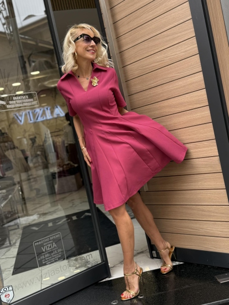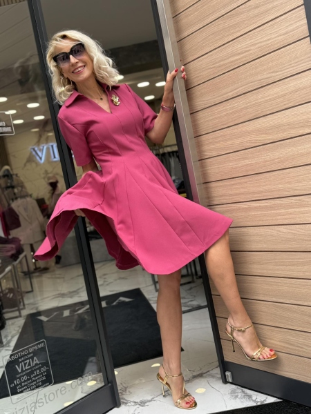 Къса рокля с вталена горна част и разкроена пола с якичка и остро деколте. Моделът се закопчава със страничен цип