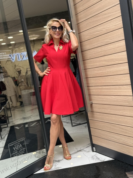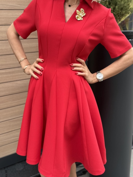 Къса рокля с вталена горна част и разкроена пола с якичка и остро деколте. Моделът се закопчава със страничен цип