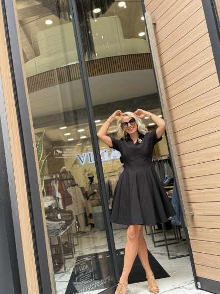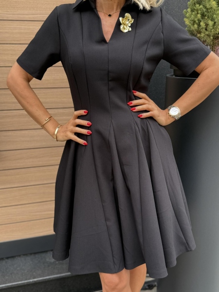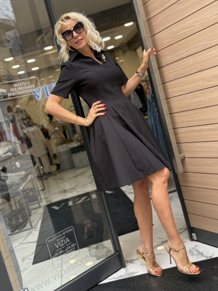 Къса рокля с вталена горна част и разкроена пола с якичка и остро деколте. Моделът се закопчава със страничен цип