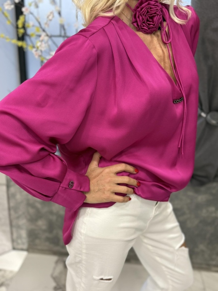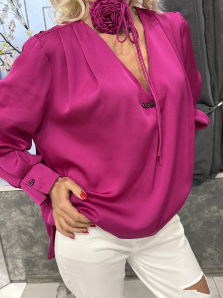 Риза в цвят фуксия от фина сатенирана материя. Моделът е със свободна кройка.
