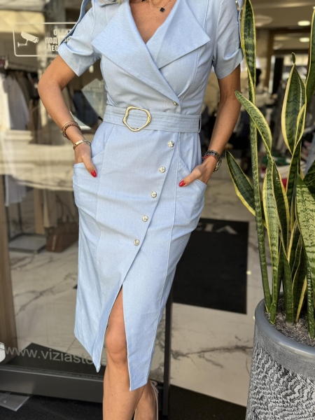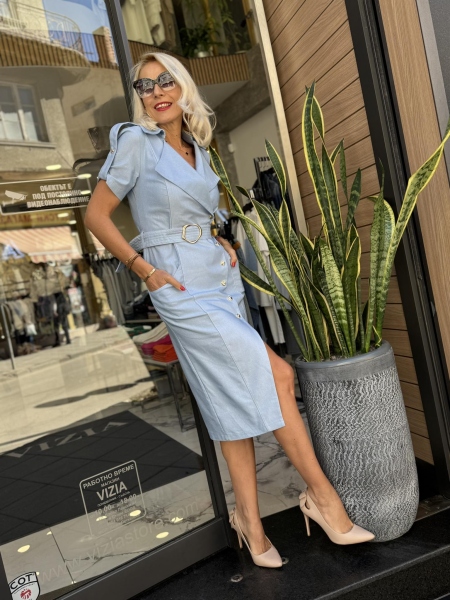 Рокля от светъл деним с втален силует с дължина под коляното. Моделът се закопчава с копчета и има текстилен колан за талията.