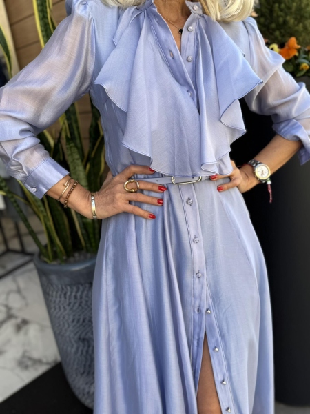 Рокля от ефирна шифонена материя с жабо на бюста. Моделът се закопчава с копчета и има колан за талията.