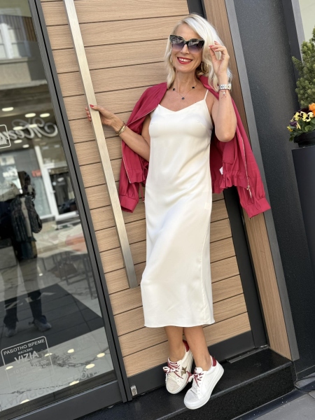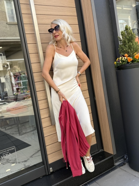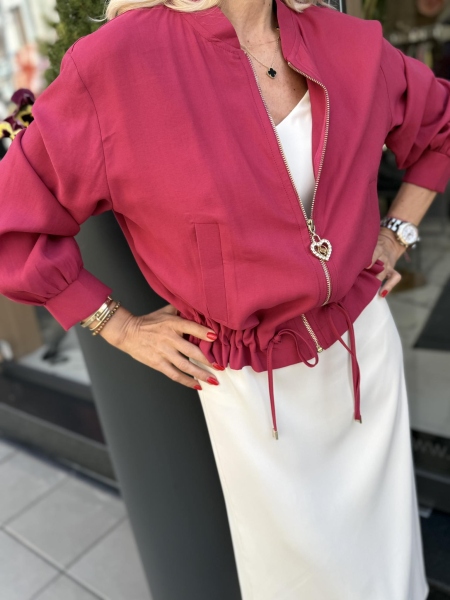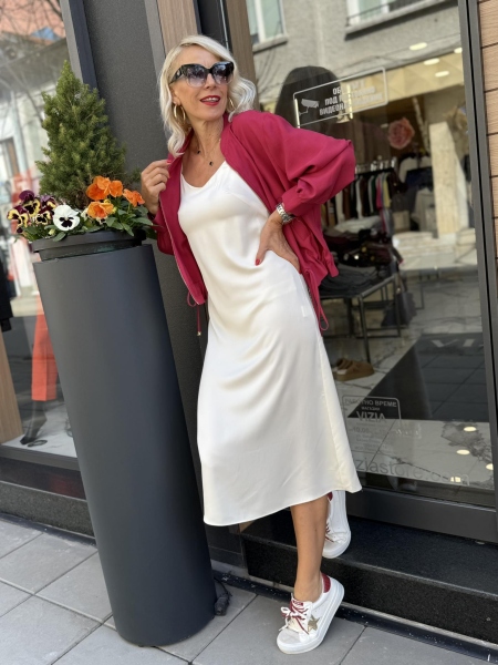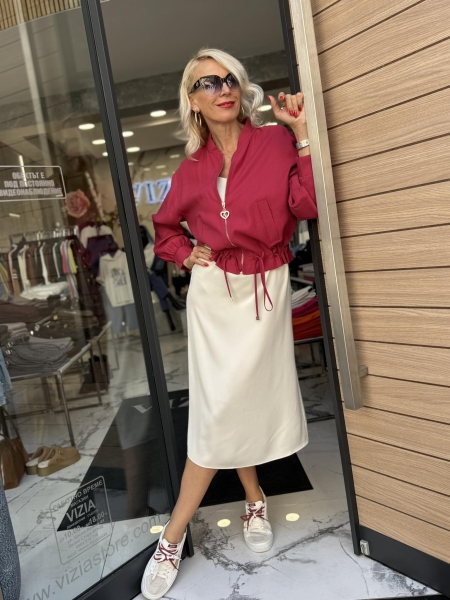 Комплект сатеирана рокля и яке от тънка материя. Якето е тип бомбър с метален цип и връзка за вталяване. Роклята е с миди дължина, тънки презрамки и без закопчаване.
