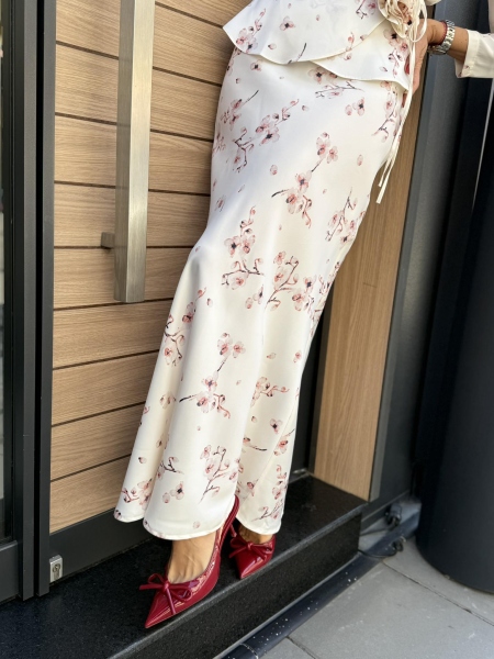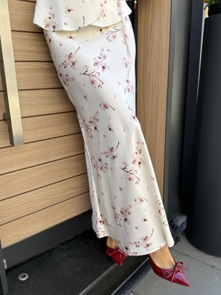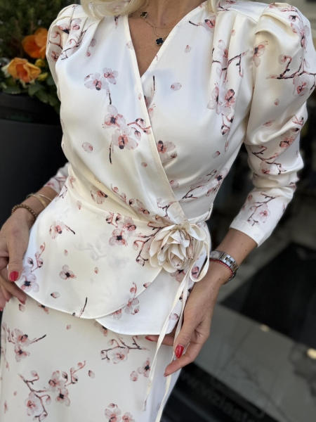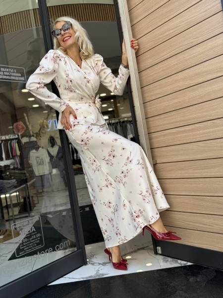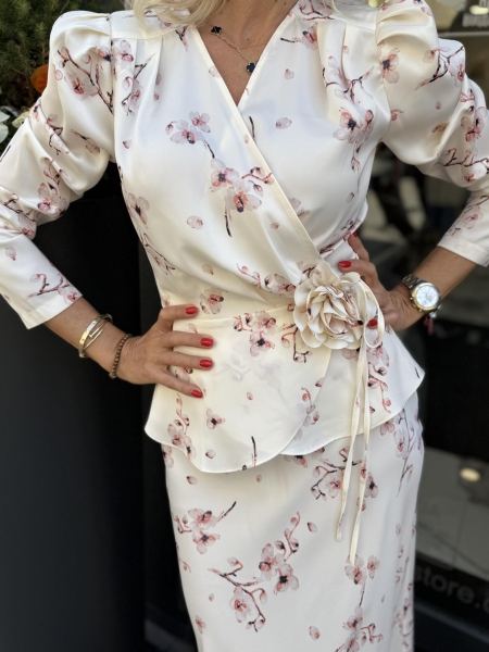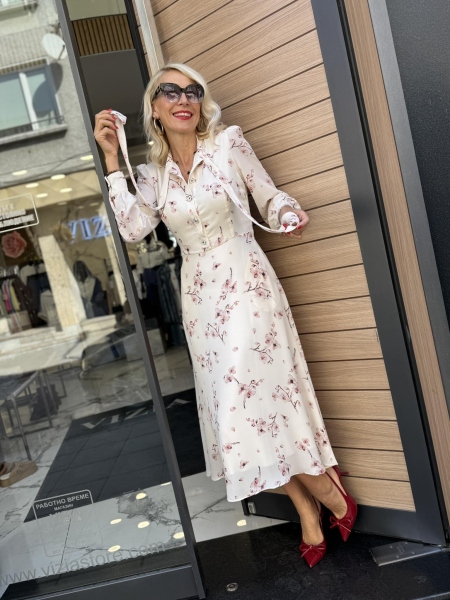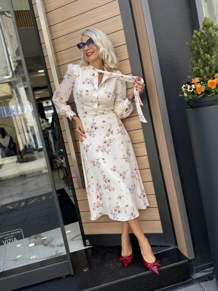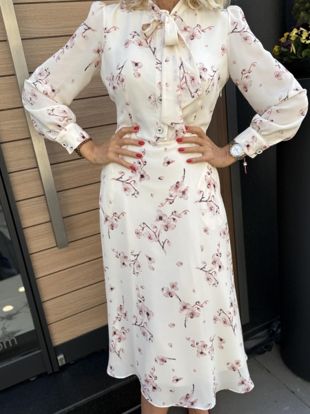 Рокля с миди дължина в цвят екрю с флорален десен. Моделът е с шев на талията и се закопчава с цип.