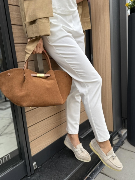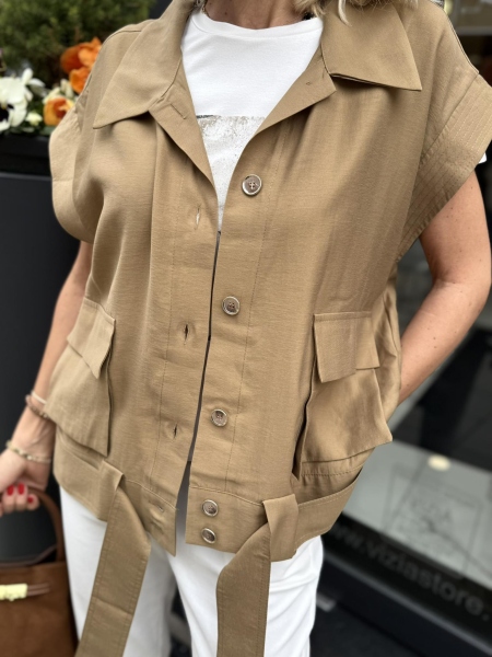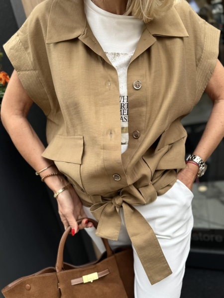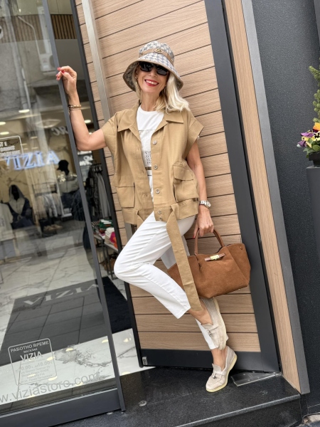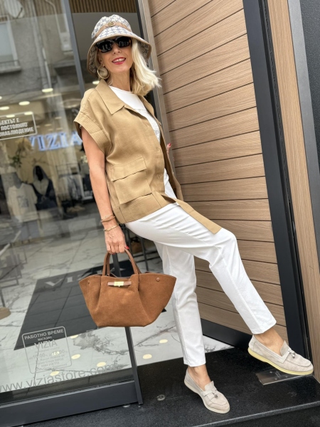 Комплект от три части в бяло и цвят камел. Връхната част е елек със свободна кройка и закопчаване с копчета. Блузата е от трико с къс ръкав. Панталонът е със стесняващи се крачоли, ластик на талията и закопчаване с цип и копче.