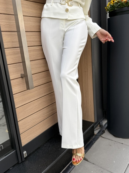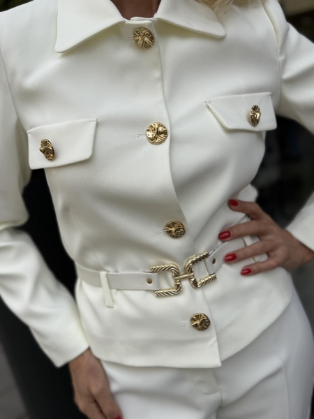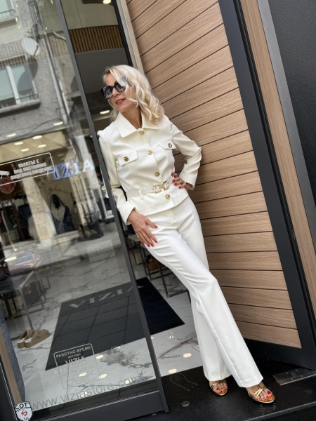 Костюм сако и панталон в цвят екрю със златисти елементи. Сакото е с права кройка, закопчаване с копчета и колан за вталяване. Панталонът е с чарлстон крачоли и ръбове. Закопчаване с цип и копче.