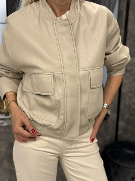 Яке тип бомбър от еко кожа в бежов цвят. Моделът се закопчава с цип и има ластик на талията. Универсален размер подходящ за M, L, XL.