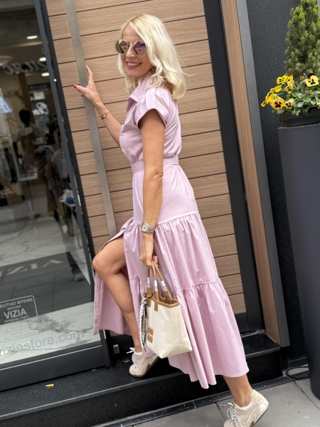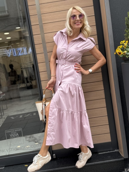 Дълга рокля от памучна материя в бледо розово с декорация от камъчета. Моделът е втален и се закопчава с копчета. Към роклята има аксесоар колан.