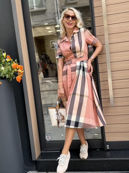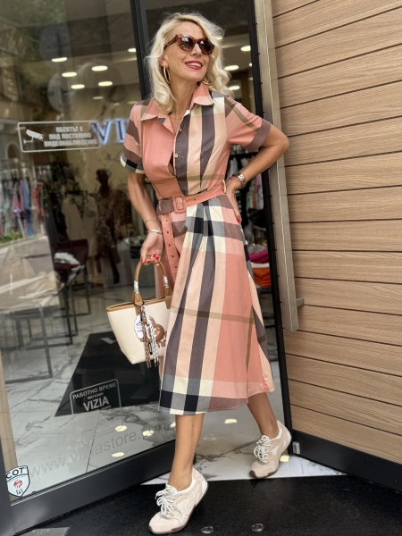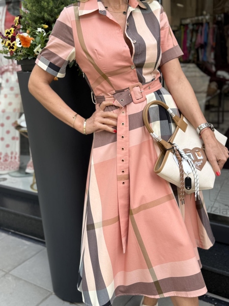 Рокля от тънка материя с къс ръкав и якичка. Моделът се закопчава със страничен цип. Към роклята има текстилен колан.