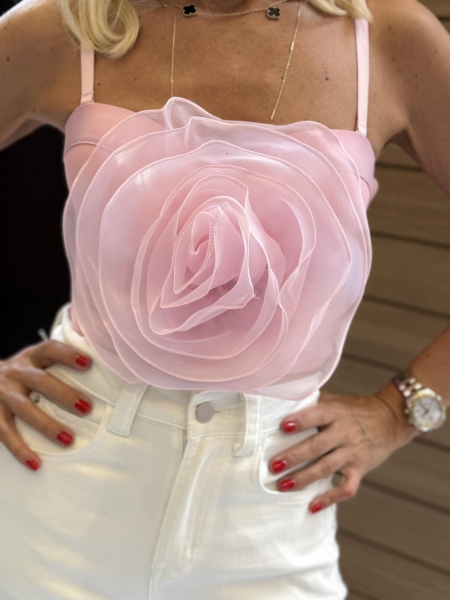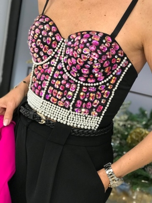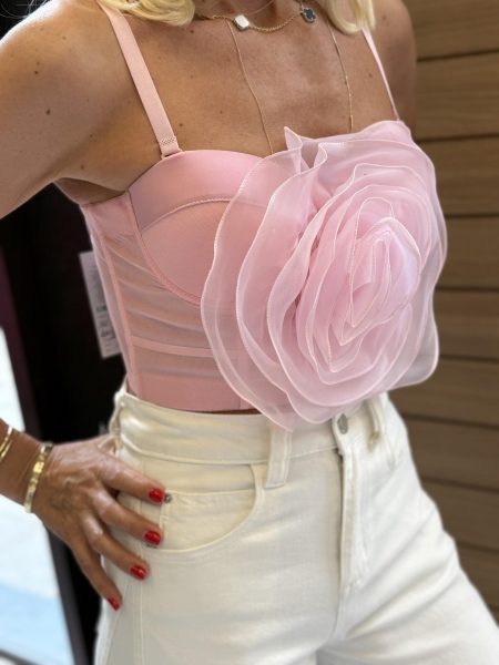Късо бюстие в розов цвят с твърди чашки. Моделът е с възможнос за регулиране на гръдната обиколка и закопчаване с метални копченца.