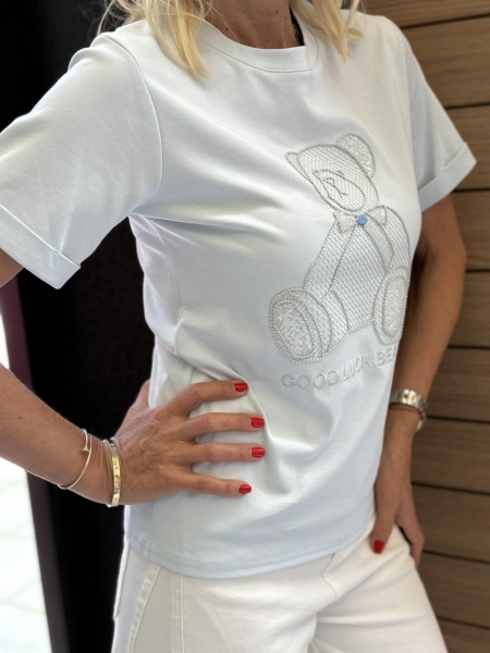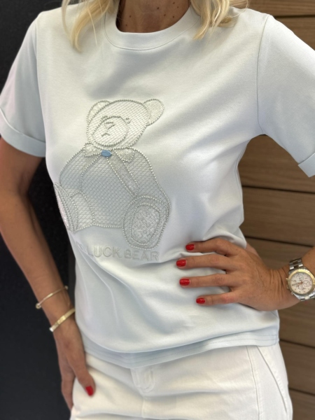 Тениска от памучно трико със свободна кройка в бледо син цвят. Универсален размер подходящ за S, M.