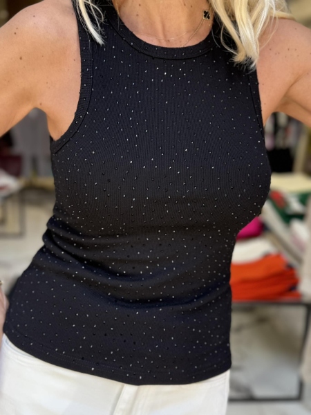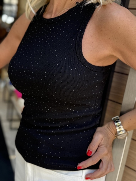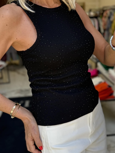 Топ от рипсено трико слим силует в черно с камъчета. Универсален размер подходящ за S, M.