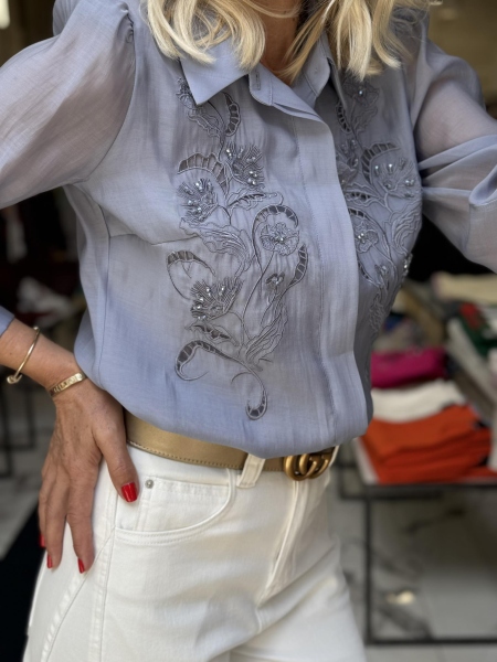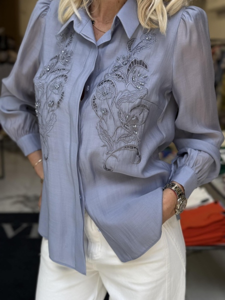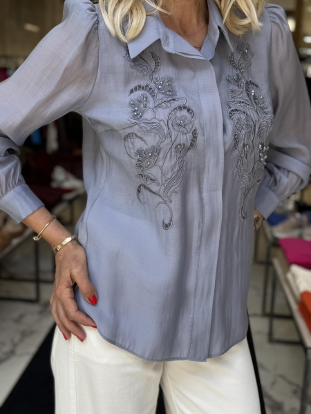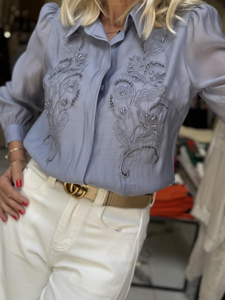 Риза от фина материя в син цвят с бродерия. Моделът е без вталяване и се закопчава с копета.