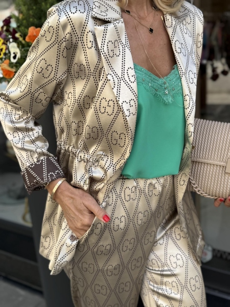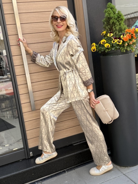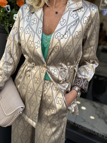 Комплект сако и панталон от сатенирана материя. Сакото е с ревери, връзки на талията за вталяване и копче. Панталонът е с ластик на талията и свободни крачоли.