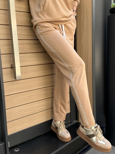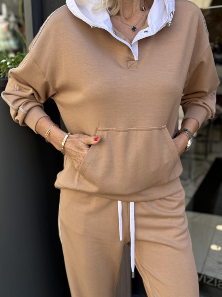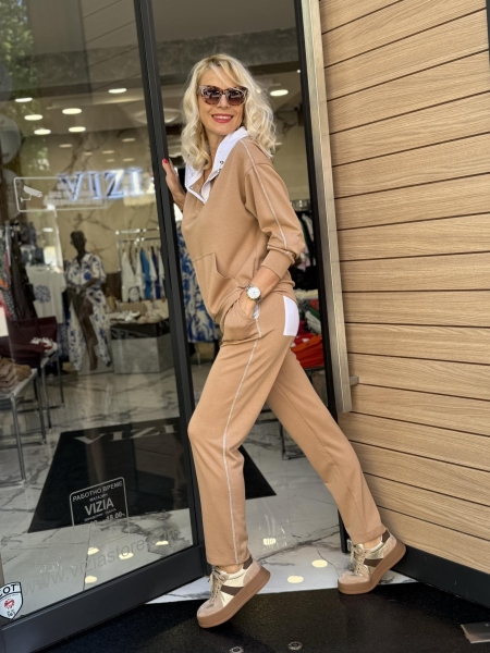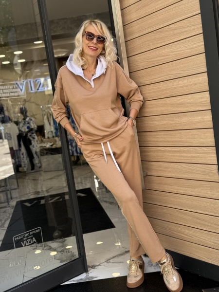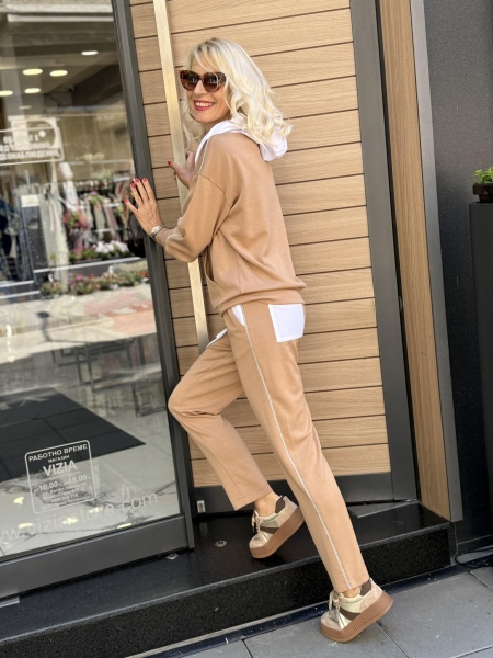 Комплект суитчер и панталон от трико в бежово и бяло. Суитчерът е свободен с качулка и копчета в предната част. Панталонът е с прави крачоли и има ластик на талията.