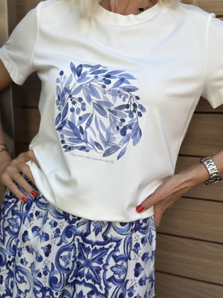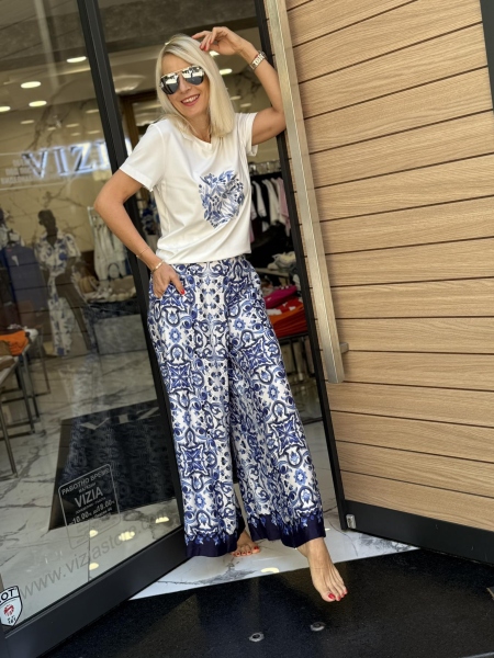 Комплект блуза и панталон тип пола в морски нюанси. Блузата е от трико със свободна кройка. Панталонът е от фин плат с много широки крачоли. Закопчаване с цип .