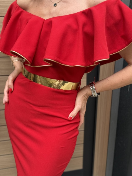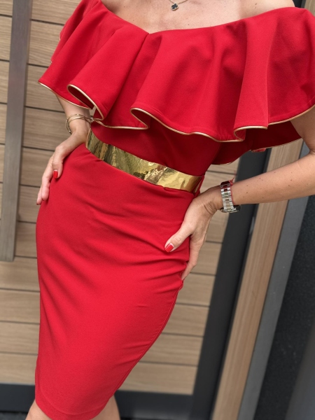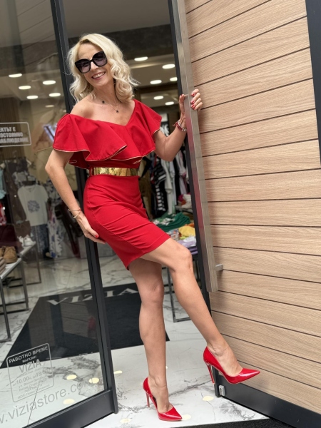 Къса рокля с втален силует и голяма харбала на бюста. Моделът се закопчава с цип. Към нея има и аксесоар колан.