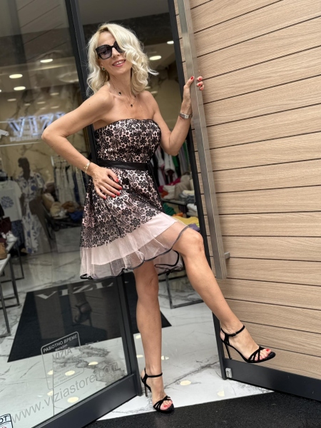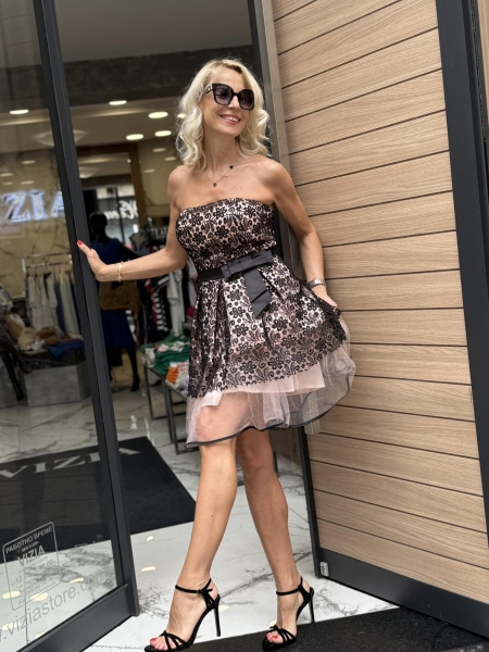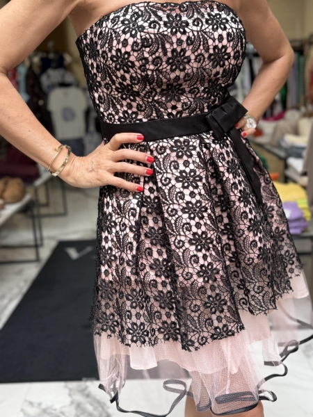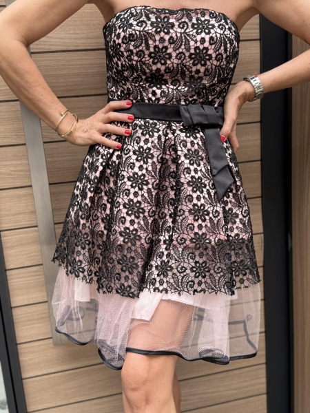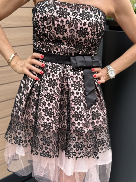 Къса рокля в розово с декорация от черна дантела. Моделът е бюстие в горната част с втален силует и заккопчаване с цип.