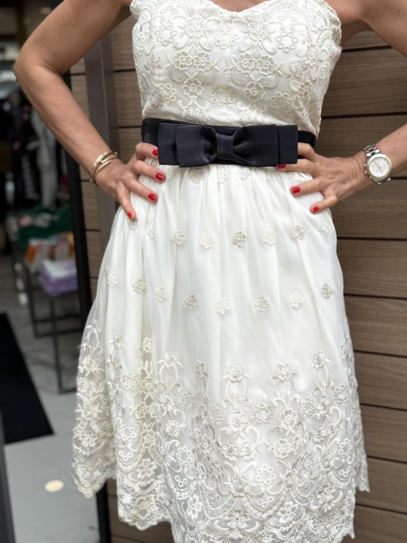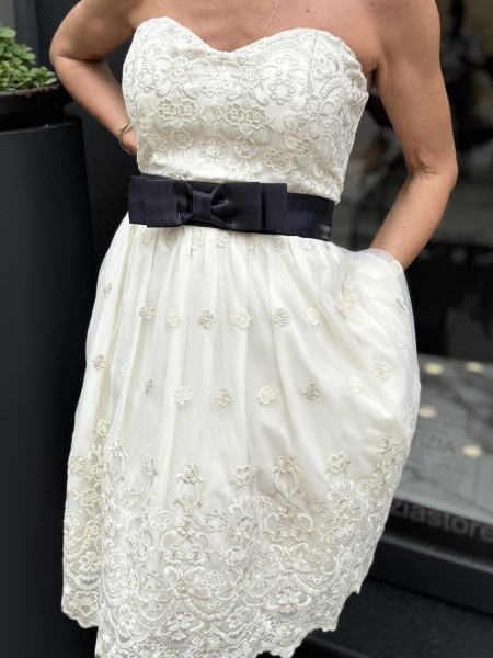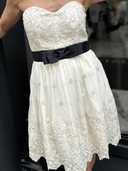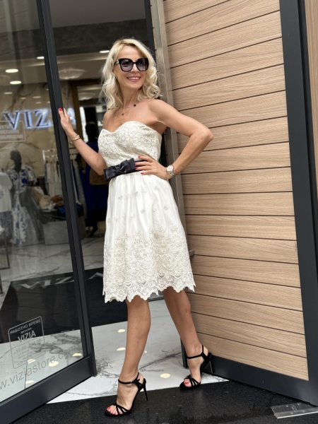 Къса рокля в цвят екрю с декорация от нежна дантела. Моделът е с бюстие в горната част, втален силует и закопчаване с цип.