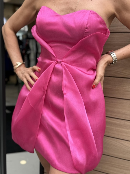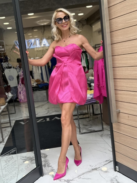 Къса рокля в цикламен цвят с втален силует. Моделът е с бюстие, закопчаване с цип и допълнителни презрамки.