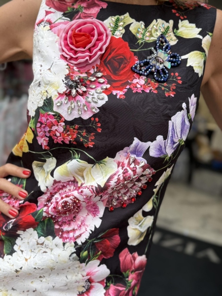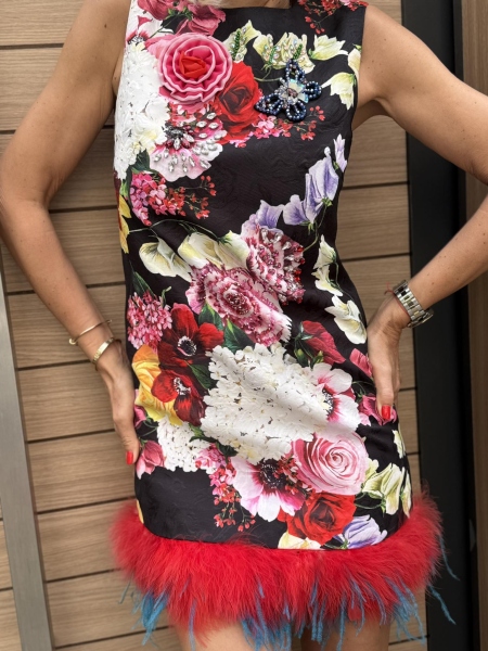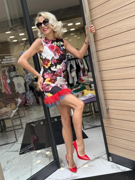 Къса рокля с втален силует с цветен десен и декорация с пера. Моделът се закопчава с цип.