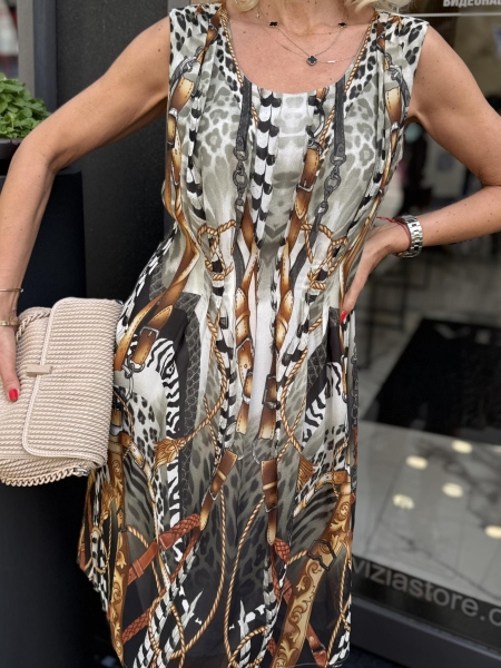 Къса рокля от фина материя с принт. Моделът е втален и се закопчава със страничен цип.