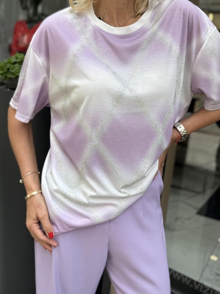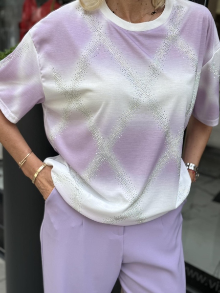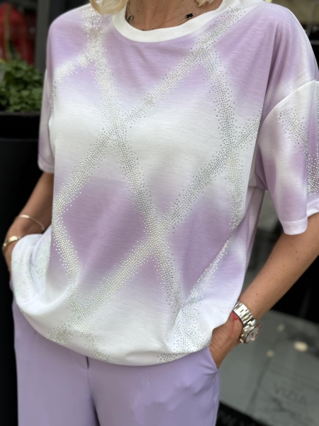 Свободна тениска в бяло и лилаво с декорация от камъчета. Моделът е универсален размер и е подходящ за M, L, XL.